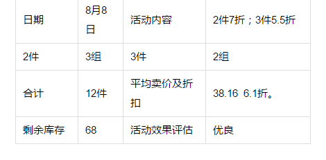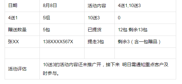 不僅需要對活動的實際銷售情況進行跟進分析,也要對活動內容進行評估,如果出現售賣情況不理想的情況,及時調整活動內容。 (2)某店某品牌紙尿褲做活動四送一,十送三。 以下是店員的統計表格: