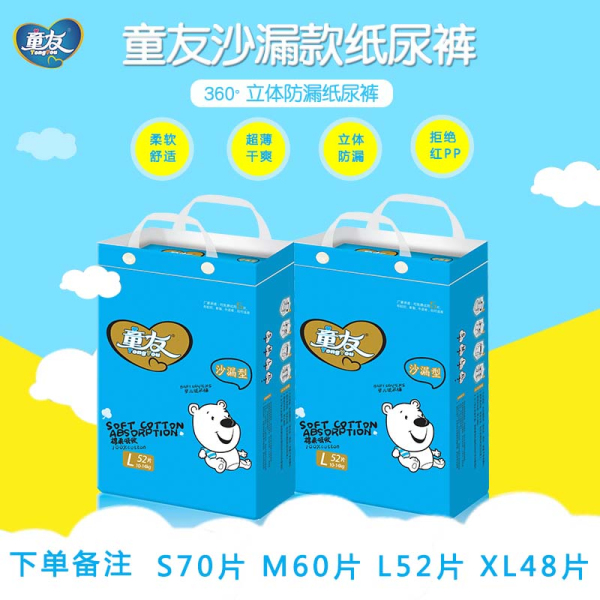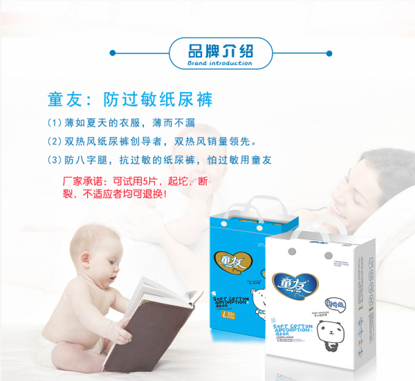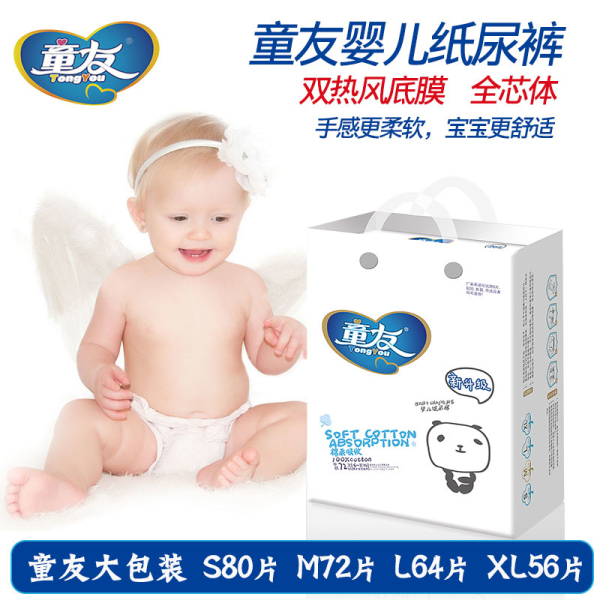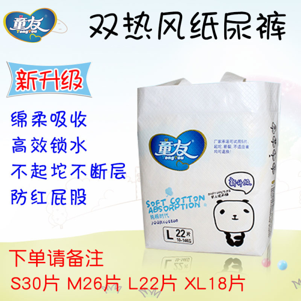 童友 紙尿褲是廣州愛茵母嬰用品有限公司生產的一款回頭率達95.73%的紙尿褲。敢在每包包裝袋右上方打上“可以免費試用五片包退包換”的售后服務,源于材料選用雙熱風材料(熱打孔面層、熱風底膜),并采用雙進口核心吸水因子,穩定性達99%。