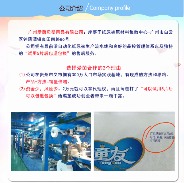 公司擁有自己的工廠生產線和專業研發團隊。童友 紙尿褲 理念是“用最少的錢,買最好品質的紙尿褲”,選擇“童友”相伴一生,給你的事業,人生帶來幸福快樂!