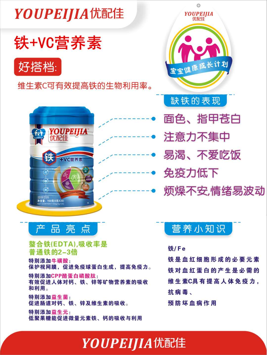 那么,如何快速有效的幫助寶寶補鐵呢?優配佳鐵+維C營養素是不錯的選擇!它是一款專為缺鐵寶寶所研發設計的專屬補鐵產品,擁有諸多優勢特點,幫助寶寶快速補鐵,有效補鐵,告別貧血必備佳品! 1、螯合鐵,吸收利用率是焦磷酸鐵的3-5倍; 2、特別添加維生素C,轉化難以補人體吸收的三價鐵為較易被吸收利用的二價鐵; 3、添加益生元+益生菌組合,促進腸道蠕動,提高吸收; 4、特別添加酪蛋白磷酸肽,分化更小更易被吸收的鐵離子,提高吸收利用率; 5、添加多種維生素和牛磺酸,促進機體代謝,吸收利用加倍。