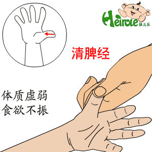 清脾經:用左手捏住孩子的手,右手指腹循大拇指側邊緣向掌根方向直推。 順運內八卦:內八卦在手掌面,以掌心為圓心,以掌心到中指根橫紋處距離的2/3為半徑,做圓圈形按揉。