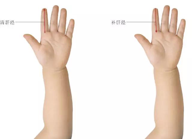 操作:將小兒的食指面向上,夾入寶媽左手虎口內,右手拇指推之。由指根推向指尖,稱為清肝經(或稱平肝或瀉肝);由指尖推向指根,稱為補肝經。一般100~500次。  作用:開郁,除煩,平肝膽之火,息風鎮驚。  主治:目赤,昏閉,煩躁不安,驚風抽搐,口苦咽干。  說明:肝經一般用清法,不用補法,若肝虛應補時,則用補腎經代之,為滋腎養肝法。因腎為肝之母,補腎即補肝。如肝實或不采用本穴,可用瀉心火,或用清天河水、清小腸穴代之,因肝為心之母,實則瀉其子,心與小腸相表里。