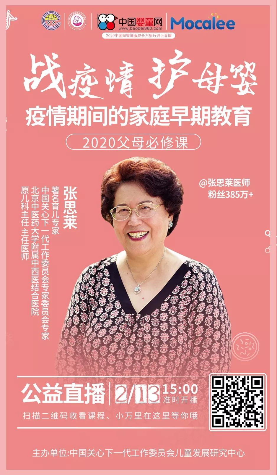 戰(zhàn)疫情,護(hù)母嬰,邁康立在行動!點(diǎn)擊海報(bào)圖,查看直播介紹小視頻。 邁康立攜手中國關(guān)心下一代工作委員會兒童發(fā)展研究中心、“國民奶奶”張思萊推出的大型公益直播《疫情期間的家庭早期教育》,將于️2020年2月13日15:00—16:00播出,歡迎您屆時(shí)收看,不見不散! 【直播專家】 “國民奶奶”張思萊醫(yī)師是國內(nèi)在線咨詢專家之一,擔(dān)任中央電視臺、中央廣播電臺、北京衛(wèi)視、湖南衛(wèi)視、山東衛(wèi)視等育兒節(jié)目嘉賓,微博微信粉絲近500萬。線上、線下科普近20年,線下、線上講座近500場,累計(jì)參與人數(shù)50,000,000,線上、線下累計(jì)覆蓋5億人次。 【直播內(nèi)容】 -兒童早期智慧主要體現(xiàn)在動手能力上。 -每個月齡段我們該如何培養(yǎng)孩子的動手能力。 -在新型冠狀肺炎疫情的特殊時(shí)期,家長應(yīng)該如何做才不會錯過孩子動手能力培養(yǎng)的關(guān)鍵期? 【如何聽課】 1.掃描海報(bào)二維碼進(jìn)入直播間聽課。 2.生成邀請碼,邀請更多朋友進(jìn)行聽課。 |