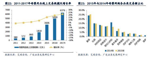 根據艾瑞咨詢的數據,2011年至2015年線上母嬰消費規模加速增長,迅速擴大。 2015年規模已達到3606億,增長率達到15.5%,預計到2017年我國線上母嬰消費將達到6376億元規模。而在線上母嬰消費各品類中,童裝所占比例最大。2015年母嬰網購交易額中,童裝占比達到25.4%,比2014年的24.1%增長了一個百分點。