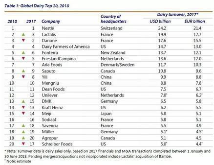 圖片來源:Rabobank 2018 乳業(yè)公司在全球百強(qiáng)食品飲料排行榜中的排名: