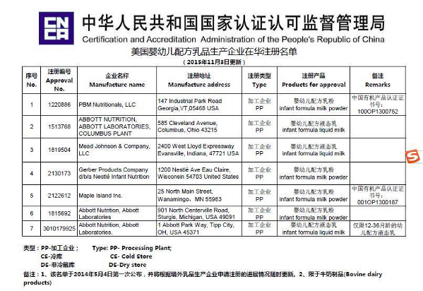 2014年5月,中國對境外的乳制品生產實施注冊,按照規定,乳制品要賣到中國去,其生產設施必須登記和認證,并符合中國的食品安全標準。該協會解釋,由于一些原因,在此之前不能將新的美國乳制品廠添加到中國的名單上,直到這份諒解備忘錄達成。 今天,小食代翻查中國認監委進口乳品境外生產企業注冊名單,其中嬰幼兒配方奶粉的名單更新時間在2015年11月,共有7家美國奶粉生產商的產品允許對華出口,包括了雅培、美贊臣、雀巢嘉寶等。