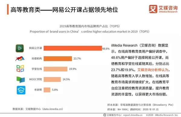未來在教育“剛需化”意識的推動下,K12在線教育將繼續升溫。值得注意的是,在線教育頭部機構們經過多年沉淀,本身已經擁有優質的教學、服務、技術資源,相比在線教育的中小企業,具備更強勁的發展潛力和更廣闊的發展前景。 隨著疫情下海量中小學生涌入在線教育平臺,頭部機構應對挑戰往往顯得更加得心應手,用戶自然也會通過直接的消費行為給教學質量有保障且口碑良好的頭部機構“投票”,成為馬太效應的“催化劑”,資源將加速向頭部自然傾斜,本已處于領跑位置的機構們無疑將持續增大優勢,在線教育行業有望迎來巨頭崛起。 綜上所述,艾媒咨詢分析師認為,受政策利好、社會教育意識加強的影響,未來K12在線教育市場需求將繼續增大,綜合實力更強、更加關注用戶體驗及需求的產品將進一步擴大領先優勢。同時,疫情發展將加劇馬太效應的影響,在線教育頭部機構的領先潛力將進一步激發。繼好未來和新東方兩大線下巨頭之后,在線教育能否迎來新巨頭的誕生,整個行業都在拭目以待。 部分圖片、數據節選自艾媒研究院發布的《2019-2020年中國在線教育行業發展研究報告》 |