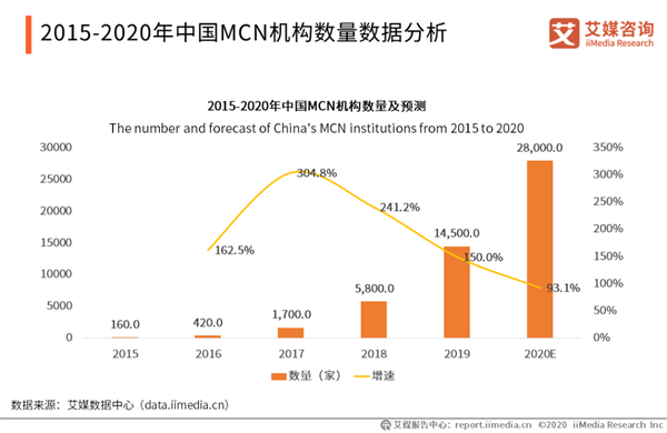 市場(chǎng)數(shù)據(jù)分析(節(jié)選): 2015-2020年中國MCN機(jī)構(gòu)數(shù)量數(shù)據(jù)分析 作為內(nèi)容產(chǎn)業(yè)的新興鏈路,中國MCN產(chǎn)業(yè)自2017年出現(xiàn)了爆發(fā)式增長(zhǎng),機(jī)構(gòu)數(shù)量從數(shù)百家量級(jí)猛漲到上萬家量級(jí),平均同比增速大于100%。預(yù)計(jì)到2020年,中國MCN機(jī)構(gòu)數(shù)量將突破兩萬家,達(dá)到28000家。艾媒咨詢分析師認(rèn)為,中國MCN機(jī)構(gòu)數(shù)量急劇增長(zhǎng),內(nèi)容產(chǎn)業(yè)入局者越來越多,行業(yè)競(jìng)爭(zhēng)會(huì)更加激烈。