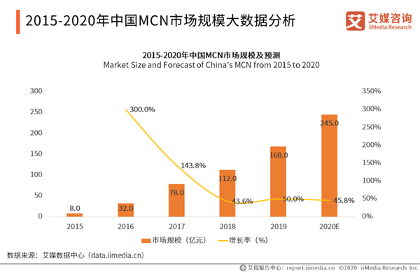 2015-2020年中國MCN市場(chǎng)規(guī)模大數(shù)據(jù)分析 自2016年起中國MCN市場(chǎng)規(guī)模迅速擴(kuò)張,2018年市場(chǎng)規(guī)模達(dá)到百億級(jí),在2019年的直播電商帶貨效益不斷展現(xiàn)后,預(yù)計(jì)到2020年中國MCN市場(chǎng)規(guī)模將進(jìn)一步擴(kuò)展,達(dá)到245.0億元。艾媒咨詢分析師認(rèn)為,目前電商直播的變現(xiàn)效益正在逐步展現(xiàn),2020年MCN機(jī)構(gòu)將享受到行業(yè)紅利,但隨著資本入駐以及MCN機(jī)構(gòu)的不斷增加,行業(yè)競(jìng)爭(zhēng)將更加激烈。