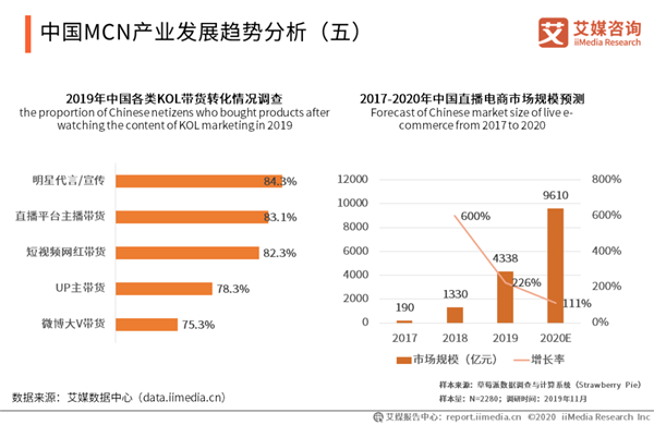 中國MCN產(chǎn)業(yè)發(fā)展趨勢(shì)分析(五) iiMedia Research(艾媒咨詢)數(shù)據(jù)顯示,明星或者網(wǎng)紅KOL帶貨轉(zhuǎn)化率都在75%以上,直播電商行業(yè)發(fā)展火爆,預(yù)計(jì)到2020年中國直播電商銷售規(guī)模將達(dá)9160億元,約占中國網(wǎng)絡(luò)零售規(guī)模8.7%。 艾媒咨詢分析師認(rèn)為,直播電商主要是通過明星/網(wǎng)紅精準(zhǔn)營(yíng)銷帶貨從而獲取營(yíng)利收入。相對(duì)于其他內(nèi)容形式來說,直播電商市場(chǎng)天花板更高、變現(xiàn)能力更強(qiáng),將會(huì)成為MCN發(fā)展的一個(gè)重要方向。但值得注意的是,并不是所有的產(chǎn)品都具備直播性質(zhì),而有些沖動(dòng)消費(fèi)也不具有內(nèi)容解釋空間。