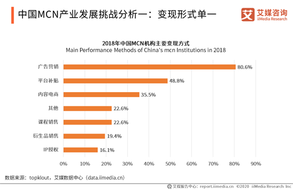 行業(yè)趨勢(shì)分析(節(jié)選): 中國MCN產(chǎn)業(yè)發(fā)展挑戰(zhàn)分析一:變現(xiàn)形式單一 目前MCN機(jī)構(gòu)主要商業(yè)變現(xiàn)形式是廣告營(yíng)銷和平臺(tái)補(bǔ)貼,廣告營(yíng)收是大頭,主流變現(xiàn)形式單一。艾媒咨詢分析師認(rèn)為,MCN機(jī)構(gòu)的商業(yè)價(jià)值很大程度上來說是分割了品牌商在互聯(lián)網(wǎng)的一部分投放資金,但品牌商廣告投放主陣地是在電視媒體,加上近年來電梯廣告的沖擊,互聯(lián)網(wǎng)投放廣告的比例并不樂觀。未來,多渠道探索商業(yè)變現(xiàn)形式是MCN發(fā)展的出路之一。