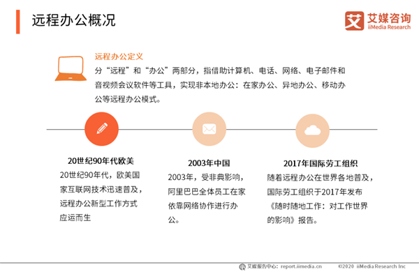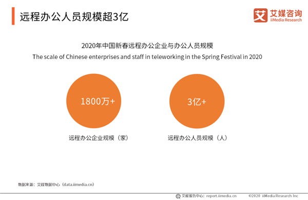 遠(yuǎn)程辦公人員規(guī)模超3億 iiMedia Research(艾媒咨詢)數(shù)據(jù)顯示,2020年新春復(fù)工期間,中國(guó)有超過(guò)1800萬(wàn)家企業(yè)采用了線上遠(yuǎn)程辦公模式,共計(jì)超過(guò)3億用戶使用遠(yuǎn)程辦公應(yīng)用。艾媒咨詢分析師認(rèn)為,遠(yuǎn)程辦公當(dāng)前爆發(fā)式的增長(zhǎng),有望成為行業(yè)進(jìn)一步發(fā)展的良好契機(jī)。