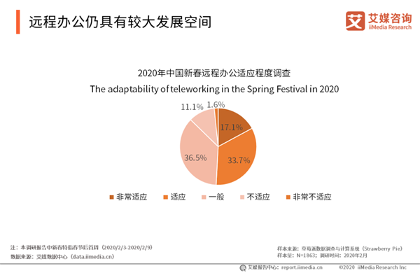 遠(yuǎn)程辦公仍具有較大發(fā)展空間 iiMedia Research(艾媒咨詢)數(shù)據(jù)顯示,在遠(yuǎn)程辦公適應(yīng)程度調(diào)查中,超過(guò)五成的受訪用戶表示適應(yīng)遠(yuǎn)程辦公模式。艾媒咨詢分析師認(rèn)為,受疫情影響,在線辦公軟件短期需求爆發(fā)明顯,現(xiàn)階段遠(yuǎn)程辦公功能相對(duì)簡(jiǎn)單,用戶對(duì)遠(yuǎn)程辦公具有較強(qiáng)的適應(yīng)性。未來(lái)隨著5G技術(shù)、云計(jì)算等技術(shù)發(fā)展,應(yīng)注重技術(shù)改善及功能優(yōu)化,以提升用戶體驗(yàn),培養(yǎng)長(zhǎng)期用戶粘性。