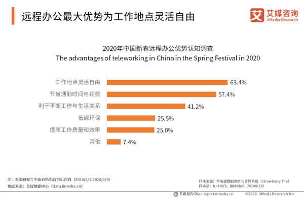 遠(yuǎn)程辦公最大優(yōu)勢(shì)為工作地點(diǎn)靈活自由 iiMedia Research(艾媒咨詢)數(shù)據(jù)顯示,63.4%的受訪用戶認(rèn)為遠(yuǎn)程辦公的優(yōu)勢(shì)在于工作地點(diǎn)靈活自由,57.4%受訪用戶認(rèn)為遠(yuǎn)程辦公節(jié)省了通勤時(shí)間與花費(fèi)。艾媒咨詢分析師認(rèn)為,遠(yuǎn)程辦公主要借助互聯(lián)網(wǎng)技術(shù)進(jìn)行線上辦公,受工作地點(diǎn)影響小,辦公安排較為靈活。此外,在家辦公節(jié)省了通勤時(shí)間與交通費(fèi)用,較為方便快捷。