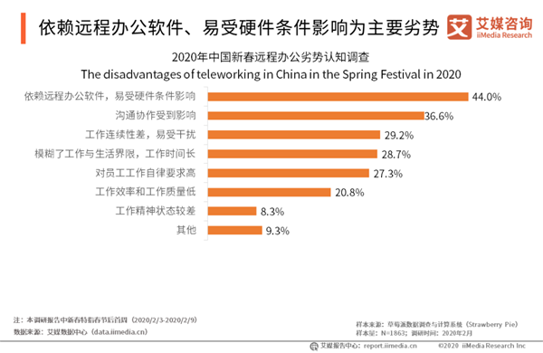 依賴遠(yuǎn)程辦公軟件、易受硬件條件影響為主要劣勢(shì) iiMedia Research(艾媒咨詢)數(shù)據(jù)顯示,超四成的受訪用戶遠(yuǎn)程辦公存在依賴遠(yuǎn)程辦公軟件,易受硬件條件影響的問(wèn)題,近四成受訪用戶認(rèn)為,遠(yuǎn)程辦公溝通協(xié)作受到影響。艾媒咨詢分析師認(rèn)為,遠(yuǎn)程辦公嚴(yán)重軟件條件和硬件設(shè)備的影響,網(wǎng)速條件、軟件運(yùn)行情況等都會(huì)影響工作開(kāi)展,遠(yuǎn)程辦公平臺(tái)應(yīng)注重優(yōu)化各項(xiàng)功能、提升用戶體驗(yàn)。