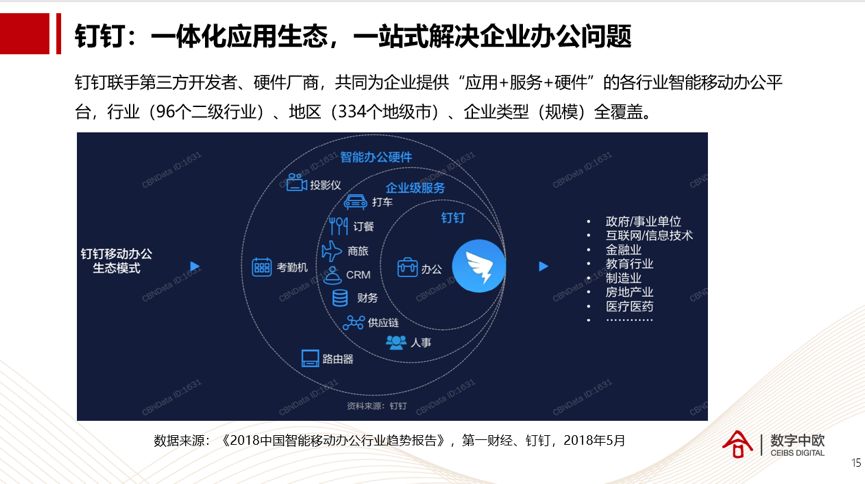 5、新的商業操作系統 普華永道的調研發現,如今企業的辦公環節中,至少有一個環節,能夠達到移動化的比例在81%左右。2020年全球將會有100億臺的移動設備進入使用。這些都是協同辦公需要去注意的,不管是在安全方面,還是在這個數據的流轉方面,是不是能夠彈性兼容更多的智能設備,又能夠保證企業資產的安全。協同辦公作為移動化的入口,會往生態化的方向發展。 我們以釘釘為例,阿里集團經常說要做新商業操作系統。我們想一想,以前每個企業都必然要用到的商業操作系統是什么呢?PC時代,是微軟的Windows,企業幾乎每天電腦都要運行Windows。現在企業幾乎每個人都會有一個手機。這個手機的操作系統就是iOS或者安卓。 而到了第三代的操作系統,或者叫企業級的辦公核心是什么呢?有可能是像釘釘這一類的協同辦公軟件。企業的知識沉淀下來、企業的客戶資源、企業的員工信息、組織的管控,包括組織培訓,今天都可以沉淀到協同辦公這樣的平臺上。 協同辦公軟件一體化的應用生態圈呢,可以概況為三個環。