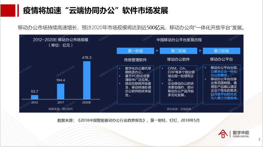 由于企業種類繁多的需求,不可能用一個軟件來實現,因此,協同辦公就成為一個平臺。釘釘目前有超過2億的用戶,大家更多的去用一些長尾的應用,甚至開發自己的套件,這就實現了一個更好的互聯網級的生態。 所以我們可以說,很多行業在IT時代用的是ERP,這是企業級資源管理工具,那么在互聯網時代就是IRP,互聯網級的資源系統平臺,用這個平臺去支撐企業不同時期的創新發展。 3、遠程辦公協助企業數字化轉型 遠程辦公的應用,起到了協助企業數字化轉型的作用。 運用遠程辦公平臺,使企業一步躍遷到移動平臺上。企業的每一個工作流,可以在線上留下數據的痕跡,從而有利于企業去改進流程和管理措施。目前企業員工的績效考評,大多是在年底大家“拍腦袋”決定的。在遠程辦公平臺下,有沒有可能,通過每一天的工作和數據,來反映這個人的工作量、活躍程度以及橫向協同的能力。這些都可以從協同辦公軟件里取得真實的數據。 現在大量的企業都采用了扁平化的結構,尤其是創新型的科技企業,很多時候我們跨部門的協同,甚至跨級別的協同,都體現出社交軟件的特點。當我們部署遠程辦公軟件之后,企業的協同,會有更好的性能。 這次不管是釘釘還是企業微信的擴容,大量的算力、流量都花在了視頻上。到了5G時代,會有更好的帶寬,去支撐像視頻會議這樣的一些創新的應用。智能化也是協同辦公軟件下一步會發展的方向,因為每天大量的工作都在云端完成,企業會有大量的企業知識、行業知識沉淀下來。企業如果能運用遠程辦公軟件打造知識中臺,從而打造一個更好的智能化的決策和決策支撐體系。 在ERP時代,企業打通了產業鏈的上下游,但現在越來越多的行業的邊界在消失,企業外部的資源開始引入企業的商業模式里。企業是否能利用遠程的協同辦公和云平臺,實現一個生態的互聯,這也是企業需要考慮的。 4、作為災備系統的遠程辦公 企業最關鍵的核心競爭力,是由它的組織結構來決定的。 如今,組織治理也在數字化。企業通過前臺大量的創新型的辦公,以“小前端+中臺”的形式,將共享的數據、業務沉淀在中臺上的共享服務中心。企業的前端可以做的很輕,甚至可以用小程序運營,這樣企業可以對接大量的行業合作伙伴,包括他們的系統和業務,這樣就能組成一個快速奔跑的創新模式,實現從組織到技術,再到業務創新的更好的引領。 這次全民上網遠程辦公的體驗之后,會不會有大量的企業開始用遠程辦公軟件,在非疫情時期,形成一個業務的災難備份?我們也是企業應對危機的方式。現在有些行業已經在嘗試,比如說政府、醫療領域都有相關的遠程運用。我們預測,這種災備的協同模式,在疫情之后,會有一個大的發展。