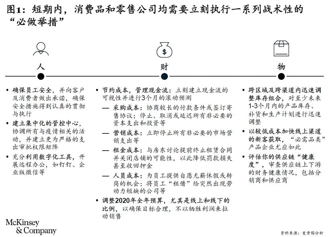 -01- 麥肯錫咨詢公司 近日,麥肯錫發(fā)布報告《消費品與零售企業(yè)的戰(zhàn)術戰(zhàn)略組合拳》中指出:此次疫情對零售行業(yè)的影響大于2003年SARS帶來的影響,但中國消費品和零售企業(yè)仍可通過迅速行動、打好戰(zhàn)術和戰(zhàn)略組合拳等方式,度過逆境。 麥肯錫認為,鑒于消費在中國GDP中的占比大幅攀升,預計此次消費品與零售行業(yè)仍將首當其沖,但對行業(yè)內不同企業(yè)的影響程度不盡相同。 消費品企業(yè)與零售企業(yè)之間的影響差異:擁有雄厚實體店基礎和大量一線員工的零售商可能會面臨更大的財務壓力,尤其是人力成本及租金。而在華擁有龐大銷售團隊和大量制造業(yè)務的消費品公司也將面臨同樣的壓力,但更主要集中在供應鏈方面。 產品類別之間的影響差異:非剛需品類(如服裝和美容),企業(yè)面對的是驟降的客戶需求,及隨之而來的現(xiàn)金流壓力。如何最大程度地保留現(xiàn)金,保持公司的正常運營,并準備疫情結束后的商業(yè)計劃以重新獲得客戶,恢復生意等,均是管理層們面臨的挑戰(zhàn)。 麥肯錫建議企業(yè)關注短期與中長期兩個方面。從短期而言,企業(yè)要采取一系列緊急戰(zhàn)術性舉措,克服陣痛;從中長期而言,企業(yè)應著眼危機后的增長和復蘇戰(zhàn)略,放眼未來,積極布局 “新常態(tài)”,建立自身的競爭優(yōu)勢。