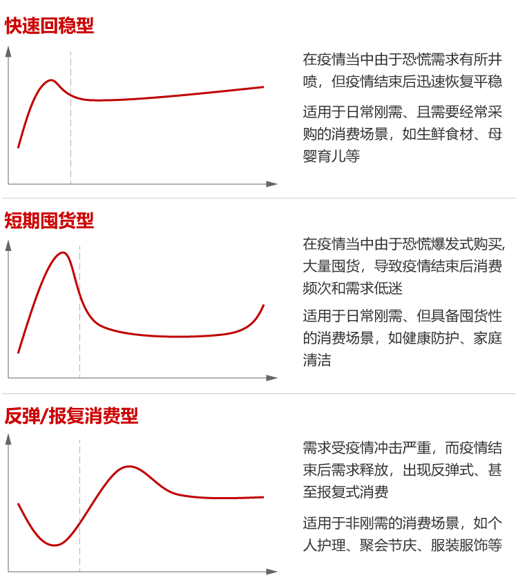 圖片來源:麥肯錫 中長期方面,麥肯錫認為以下幾個方面可重點考慮: 1. 切實加快線上 /全渠道舉措的落地推廣。 2. 推出一套有針對性的收益管理計劃。 3. 重新思考供應鏈戰(zhàn)略,優(yōu)化供應鏈設計和運營。 -02- 貝恩公司 近日,公司貝恩公司發(fā)布的《疫情之后,零售企業(yè)的“危”與“機”》報告指出,回顧以往的疫情或自然災害,零售市場一般會經歷三個階段:沖擊、恢復和回穩(wěn)。 在疫情對消費者行為和偏好的影響方面,為了更好地進行分析討論,我們將商品零售場景分為9大類,分別是:生鮮食材、休閑飲食、聚會節(jié)慶、母嬰育兒、個人護理、家庭清潔、健康防護、服裝服飾、電子電器。 貝恩發(fā)現(xiàn),不同場景在疫情結束后的需求模式和變化各不相同,大致可分為三類: