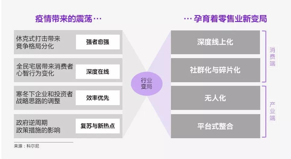 凱度咨詢在近日發(fā)布的《疫情之下,各行各業(yè)的危與機(二)——零售篇》文中指出,此次疫情對零售行業(yè)造成了直接沖擊,但便利店、無人店與自動販賣機等實體零售,各類電商,以及線上與線下的整合零售都出現(xiàn)了新的機遇。 以百貨與購物中心為例,凱度咨詢認為:短期來看,由于疫情導致的客流減少會在不同程度上對實體百貨和購物中心的生意產生影響。而就長期而言,這可能是這些企業(yè)加快數(shù)字化轉型、加強線上推廣和新工具應用、加快融合線上線下、充分挖掘會員數(shù)據(jù)的最佳契機。 線上商城、官方微信賬號、微信小程序等百貨或者購物中心自有線上平臺的重要性在今年將得到凸顯。 會員關系管理、數(shù)據(jù)深度挖掘、個性化產品以及促銷定制、實現(xiàn)高價值高質量的會員和銷售增長將會成為核心策略。 體驗式消費依舊是線下消費的主旋律,不過,如何利用新技術打造沉浸式線上購物體驗也是值得探討的一個話題。 凱度咨詢指出,從短期來看,部分渠道與業(yè)態(tài)的消費需求提升明顯;就長期而言,這次挑戰(zhàn)對培養(yǎng)新的消費習慣、開啟新的藍海、促進商業(yè)轉型與升級將起到重要的推動作用。 -05- 科爾尼(A.T. Kearney) 而管理咨詢公司科爾尼公司發(fā)布《海嘯之后,暗潮洶涌——疫情之后的零售業(yè)變局》中指出,零售行業(yè)是疫情打擊的重災區(qū),對各業(yè)態(tài)、各品類的影響不盡相同。總體來說,有三大影響: 第一,線上影響弱于線下,生鮮電商變“危”為“機”。預計疫情之后,電商占社會消費品零售總額有望從當前21%進一步提升至24%或更高。 第二,近場受創(chuàng)小于遠場。當前,對于貼近社區(qū)的超市、便利店、社區(qū)生鮮店等“近場業(yè)態(tài)”來說,生鮮和生活必需品的核心需求依然強勁,負面影響主要來自一部分政策性閉店要求和防疫措施帶來的成本上升;而“遠場業(yè)態(tài)”如購物中心、百貨、品類專業(yè)店、餐飲則普遍“休克”,現(xiàn)金流危機嚴重。 第三,大平臺韌性強于小平臺。在面對疫情的反應速度、調度能力、運營彈性上,大平臺顯示出了更強的優(yōu)勢。由細微見大勢,疫情之后,行業(yè)洗牌會更加猛烈。