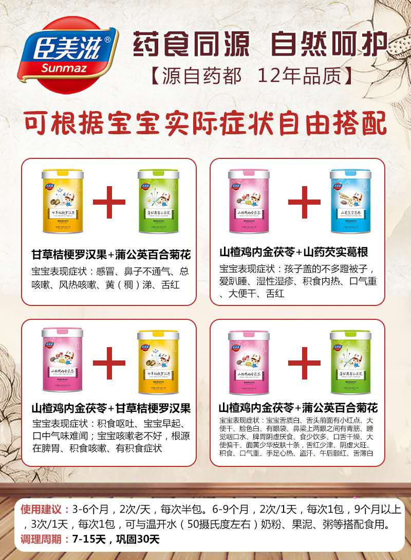 在育兒過程中,很多家長會遇到這樣的狀況:孩子食欲差,不愛吃飯、不長個,消化吸收不暢,便秘……等等,打針吃藥不僅讓孩子更加抗拒,而且還面臨抗生素的威脅。為此,越來越多家長選擇藥食同源營養(yǎng),比如臣美滋藥食同源微晶粉,溫和調(diào)理,滋補養(yǎng)護嬌嫩體質(zhì),為成長助力。 臣美滋藥食同源微晶粉系列共有四款單品,分別是山楂雞內(nèi)金茯苓、山藥芡實葛根、蒲公英百合菊花、甘草桔梗羅漢果。精選天然藥食同源食材為原料,采用微晶閃溶工藝以及口溶直飲技術(shù)制作而成,結(jié)晶粒度小易溶解,營養(yǎng)成分協(xié)作吸收,傳導(dǎo)速顯著高于普通膳食補充。健康調(diào)理,讓孩子擁有好胃口、好體質(zhì)。