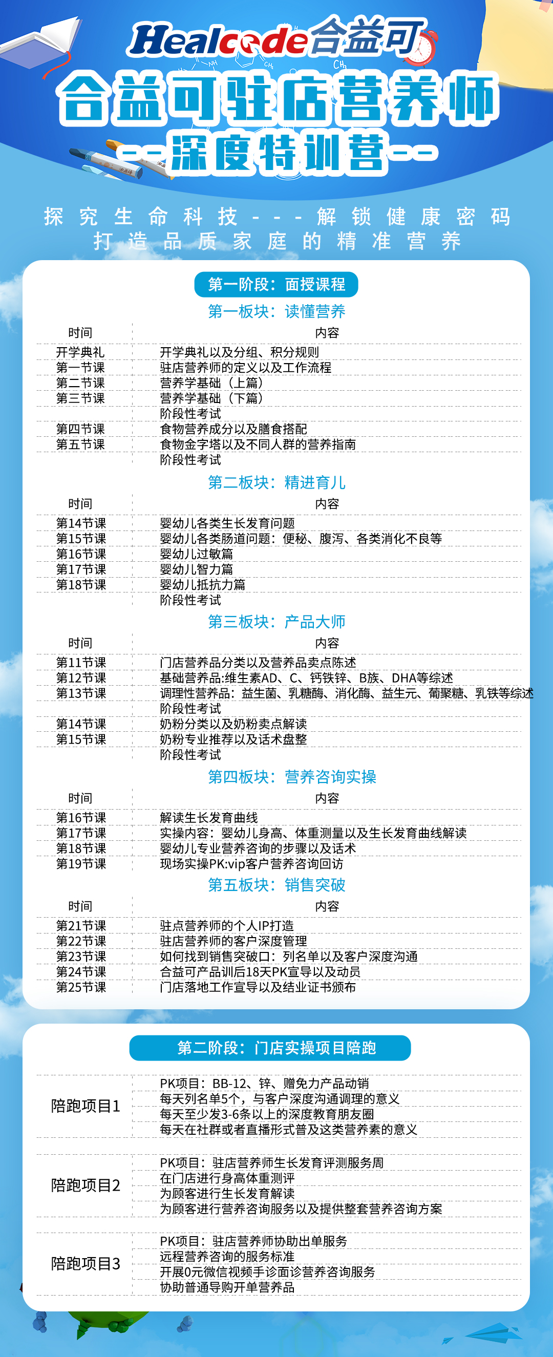 合益可挑選動銷能力強,學習意愿度高,配合度高的門店通過自身的商學院聯合第三方業內知名的培訓機構開展5天的封閉式集中訓練加18天的訓后跟蹤,通過學習一是能讓學員了解基本的營養學,從營養學的角度解讀配料表和營養成分表,學會這一招,能夠讀懂大部分的食品賣點,能夠有做評測的能力;二是學習常見嬰幼兒常見問題的原因和解決方案,如腸道問題、過敏問題、生長發育問題、抵抗力低下問題;三是了解營養品的分類以及常見營養問題的咨詢和調理方案;四是營養咨詢的全部流程以及咨詢要點;五是幫助門店營養師進行個人IP的打造,如何做客戶名單以及如何利用知識來帶動銷售。 同時我們協助參訓學員考取幾類證書:中國中醫藥信息學會+中國國家人事人才網雙證;IIAA信息化人才培養;人保部第三方職業鑒定(最正規,最貴)。第三知名大學背后打造門店網紅屬性培訓,在門店對產品知識和營養知識都能夠很好的理解以后我們攜手國內多所知名大學如上海交通大學、浙江大學開展高級營養培訓班,邀請大學及其附屬醫院的知名專家教授進行授課,不僅能夠進行專業的知識學習,還能夠讓我們終端的母嬰人獲得走進名校的機會,對自己的公信力及網紅屬性也是一種提升。 ![]() Healcode合益可一個打造網紅流量的的進口品牌 權威專業的出品方背景,合益可的出品方為美國健康時代生物科技集團,是美國大健康領域知名企業之一,集團擁有強大的全球供應鏈支持,與眾多全球生物科技企業合作,打造優質產品,Healcode系列產品的原料就來自于丹麥科漢森、日本森永、美國杜邦丹尼斯克、西班牙Biosearch等全球知名企業。 ![]() 聯合出品的還有美國營養與健康學會,是美國高水平的醫學與營養學研究組織,學會擁有美國營養學、醫學專家教授40余名,涉及醫學營養、營養免疫學、營養微生物、心血管、骨骼發育及慢性病研究等領域,致力于世界各地的嬰幼兒和老年人的健康研究。合益可系列產品由健康學會主導研發,滿足中國嬰幼兒的健康需求。 ![]() 生產工廠INFITNESS,擁有 R&D精密實驗室,獲得美國GMP和FDA認證,主要從事生物科技和生產技術的研究,為美國食品藥品行業提供優質的產品。實驗室負責益生菌含量和載體科學研究,全面支持Healcode嬰幼兒滴劑研發。